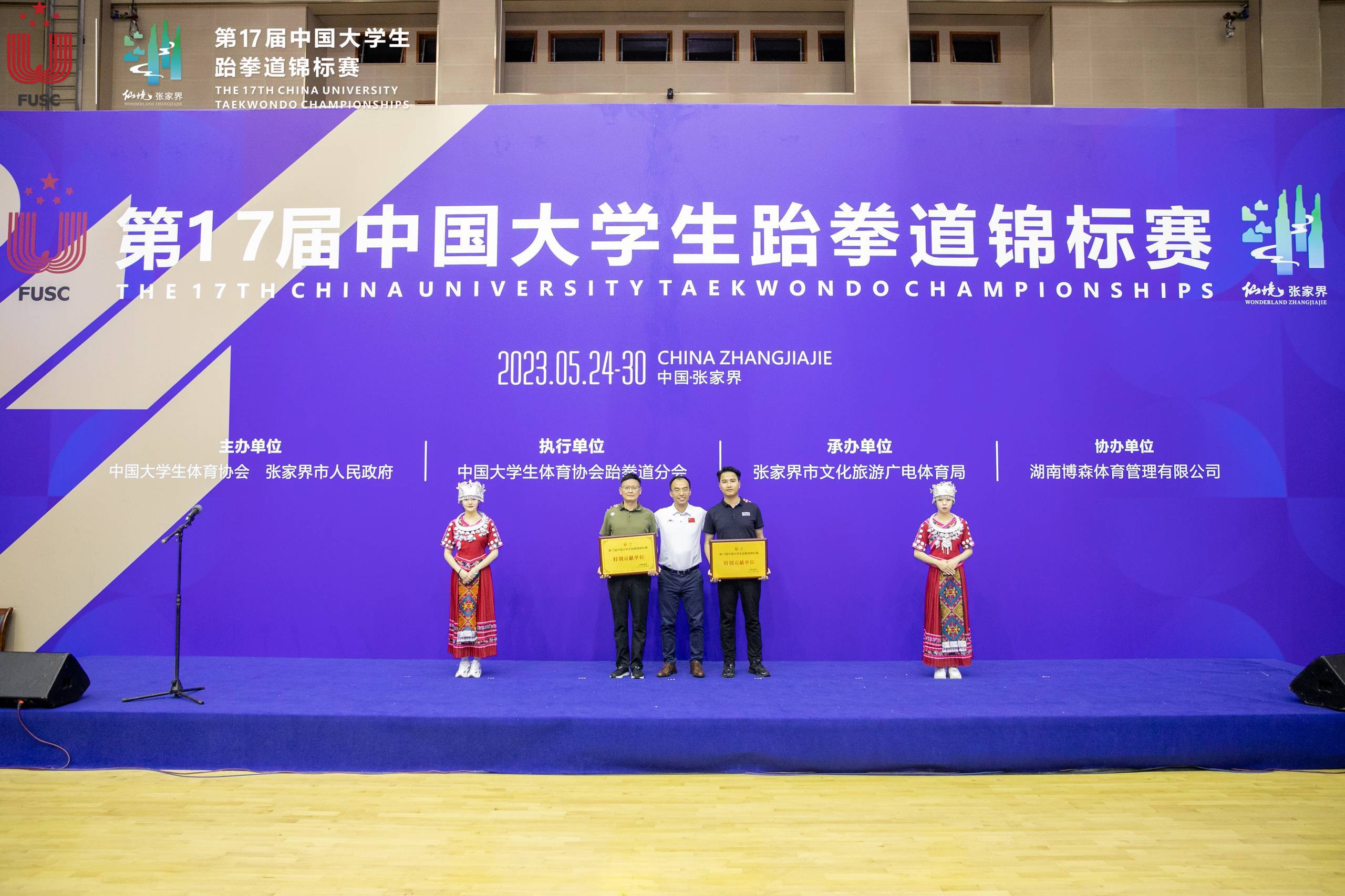 此次比赛,我司负责竞赛组织、赛事宣传、赛事接待服务等工作,具体包括运动员、教练员赛前接待服务;运动员、教练员赛中吃住行服务;赛事活动具体流程方案;志愿者、裁判员服务等工作。通过我司细心周到的赛事服务,确保了本届锦标赛的圆满成功,宣传了跆拳道体育文化、促进了张家界文体消费增长。第17届中国大学生跆拳道锦标赛闭幕式上,中国大学生体育协会跆拳道分会秘书长吴小勇为我司颁发“特别贡献单位”奖项。